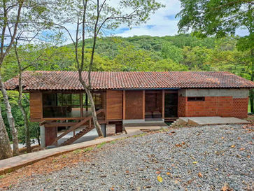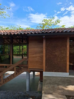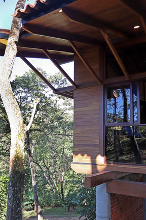 Una estructura primaria robusta de madera de pilón soporta y suspende esta casa desde un terreno inclinado al cuál intenta adaptarse percibiendose como un volumen de un solo nivel alargado desde el acceso principal y abriendose en un segundo nivel hacia la zona boscosa de la propiedad, recibiendo las brisas y rematando en una techumbre de teja de barro ancha de grandes aleros. La terraza en voladizo se convierte en el elemento que se proyecta hacia la vista desde la zona social. El uso de materiales como la piedra local, madera y una pared de bahareque que recibe desde el vestibulo hace que esta casa se sienta natural, acogedora y a la vez innovadora.
